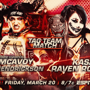 Rich Russillo: BUT SHE WALKS RIGHT INTO THE ‘MASTERCLASS’. RAVEN ROBERTS WENT RIGHT INTO THE FLAPJACK KISS TO THE HEAD AND ‘THE BIRD OF PREY’ IS OUT COLD!! SHE’S OUT LIKE A LIGHT AS “DRIZZY & VIZZY” GANG UP ON THE OTHER HALF, REX MCALLISTER.